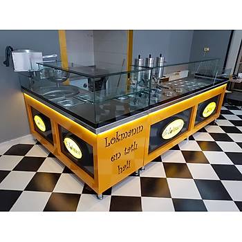 Tezgah Ölçüleri: 290X80X135 Tezgah Ekipmanları: Sıcak çikolata, Pompa, Topiks, Kasa Tezgahı ve 200x80x135 Ebatında Elektrikli Jijital Pişirici, Elektrikli Lokma Makinesi, +3 Adet Çikolata Dolum Pompası